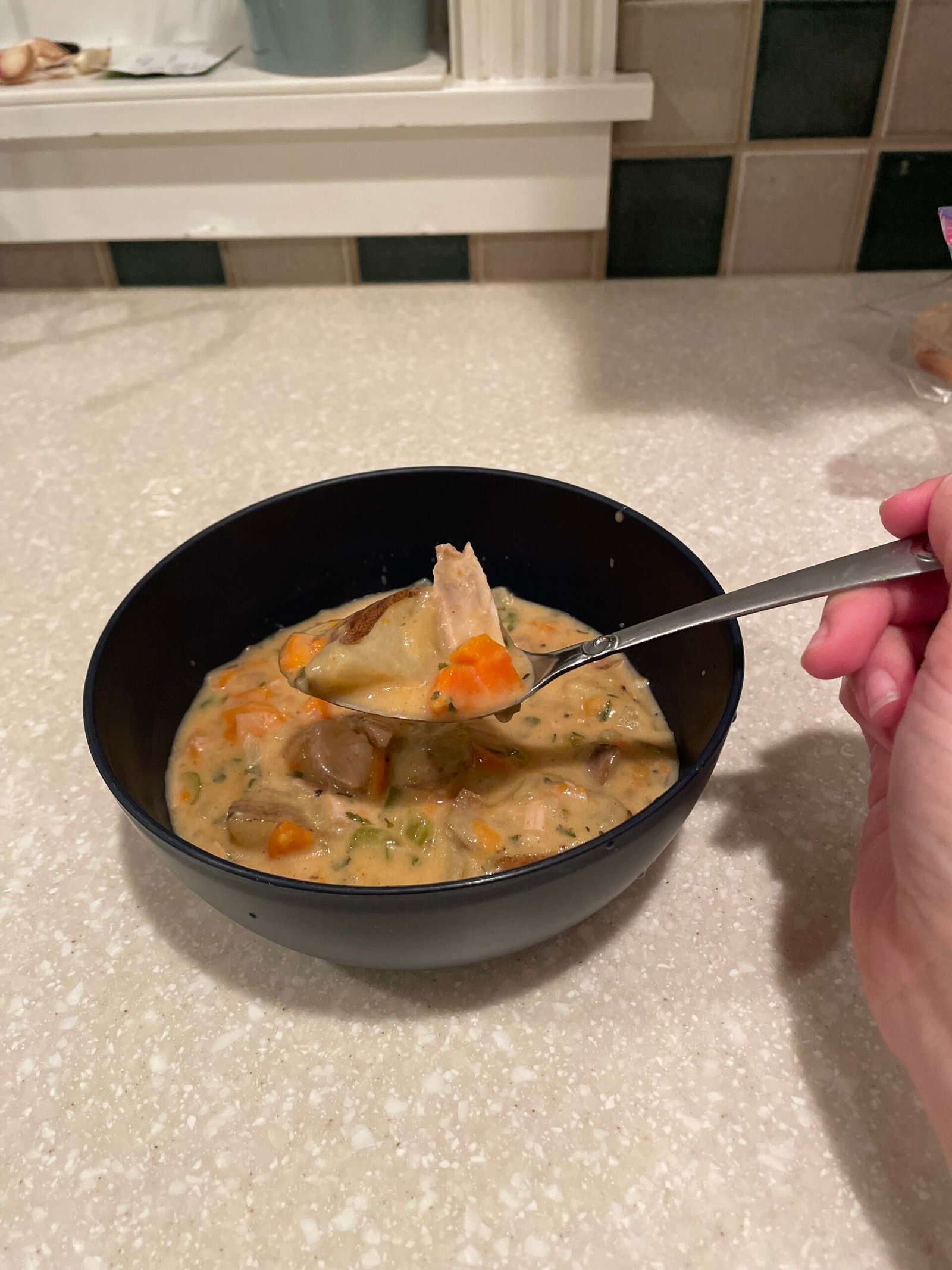 - Add turkey and flour mixture to soup. Stir until incorporated. Simmer until meat is warmed throughout.